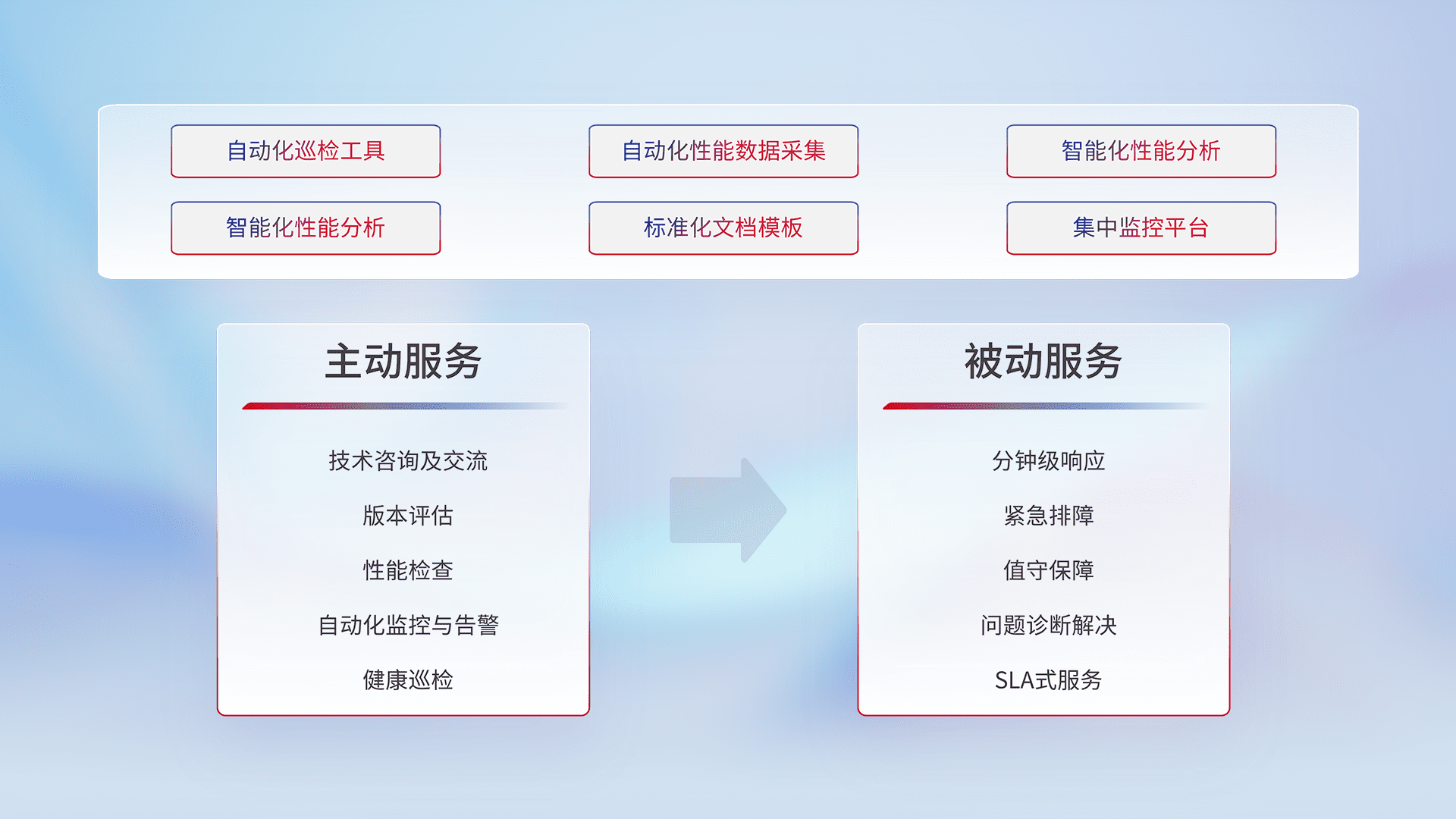 智能化工具和标准化文档,,保障服务质量,,,提供主动服务(包含技术咨询、、、、版本评估、、性能检查、、自动化监控与告警、、、健康巡检)和被动服务包含(分钟级响应、、紧急排障、、值守保障、、问题诊断解决、、、、SLA服务)。。。